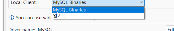 Local Client 라는 항목에서 MySQL binaries 로 설정해준다.