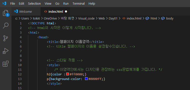 css는 뒤에나오는 h2와 p의 색깔을 주는 값이 적혀있습니다.