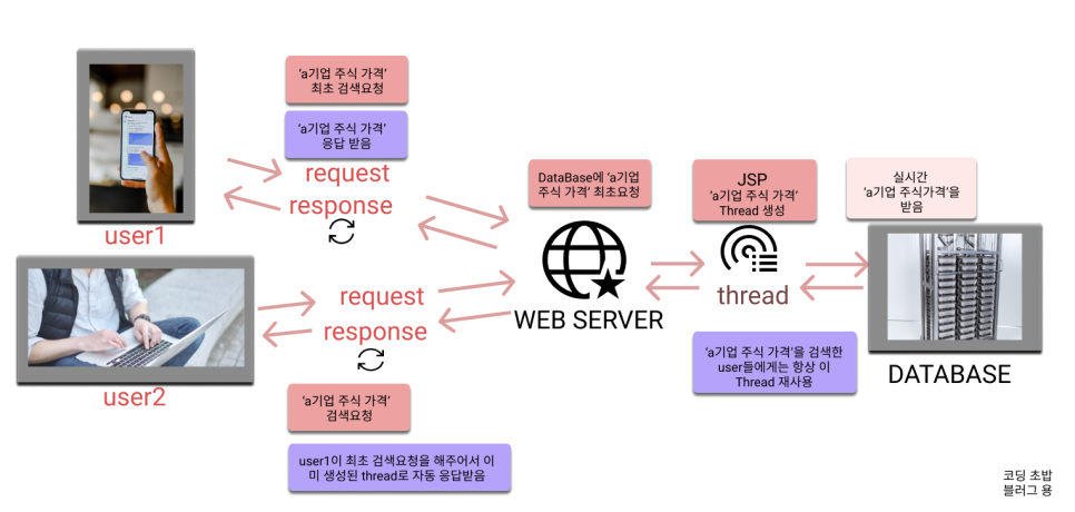 1.JSP로 Thred 기능을 써서 클라이언트가 요구하는 메모리를 최초 한 번만 로드하여서 다른 사용자가 같은 메모리를 원한다면 Thred가 재사용되어 Response(응답) 해줍니다