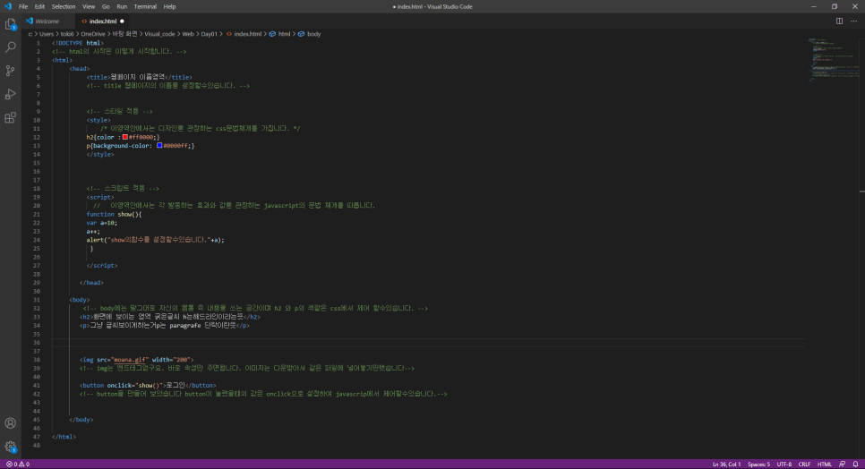 html 안에 css 와 javscript를 써서 예제를 만들어보겠습니다.