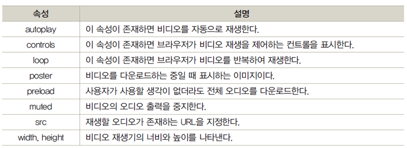 src="movie.mp4" : 비디오 소스 파일 경로(url)